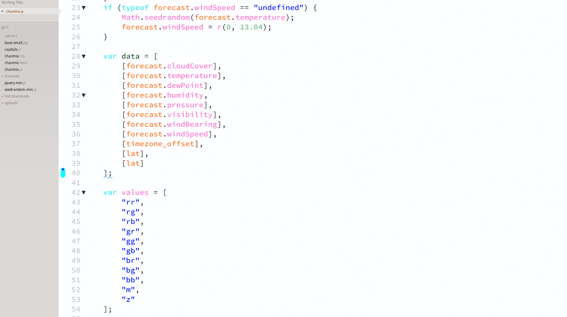 Code is based on matching data to 12 colour channel variables, for example temperature affects ‘red-green’ channel